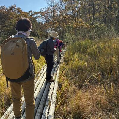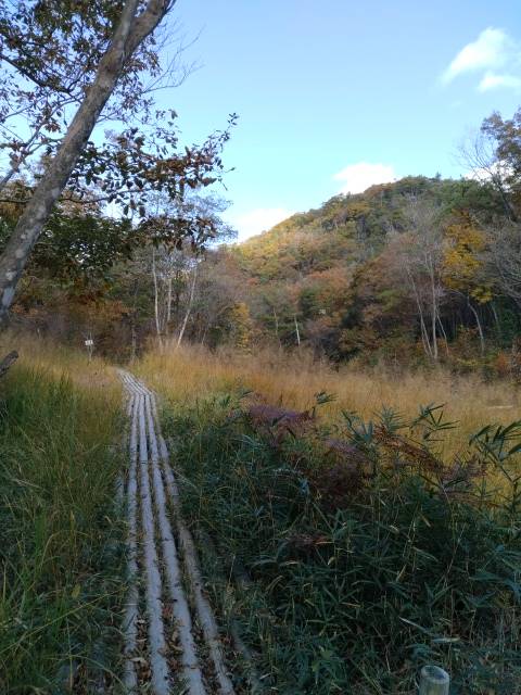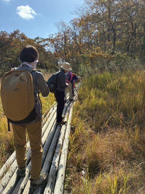 ちゃちゃっと降りて丸山湿原へ。稀少種の花で有名な湿原だけど「花のない時期だしなぁ…」と思いながら、行くと「なんの、なんの!」秋色の湿原の美しい事!そして季節外れと思しきウメバチソウの花。仲間の帽子に飛んできたハッチョウトンボ。・・・今、11月なんだけど・・・。