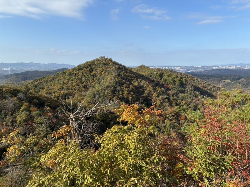 傾斜の強い斜面を慎重に下り数曽寺峠に着く。ここから車を止めた登り口までは谷沿いに良い道があるようだ。大坂山へは、真っ直ぐ尾根伝いに、今日最後の280m余りを登る。登るにつれ播磨平野の向こうに瀬戸内海や淡路島、小豆島まで見えてくる。所々に小さな岩が現れ、よい展望台を提供してくれる。