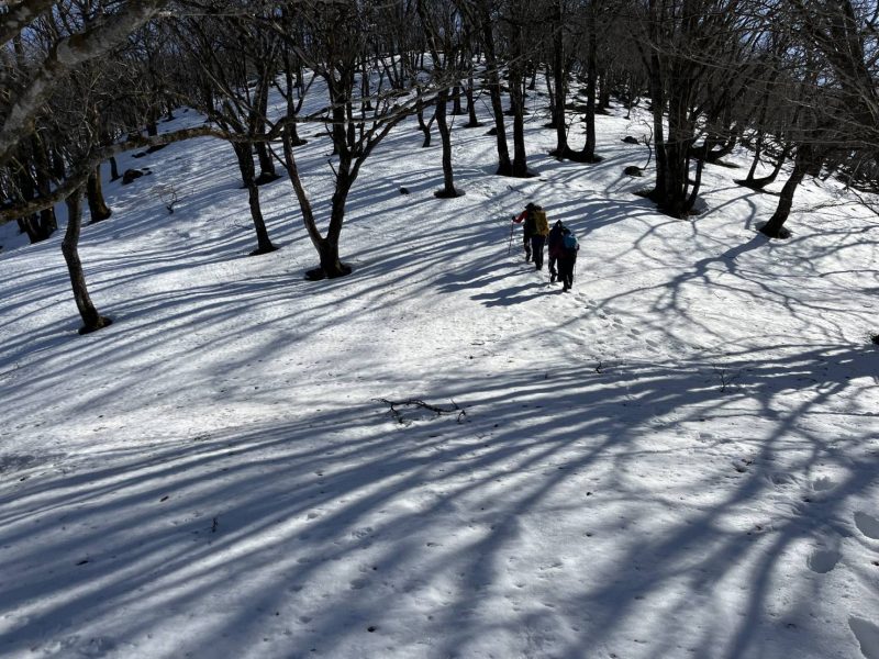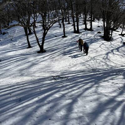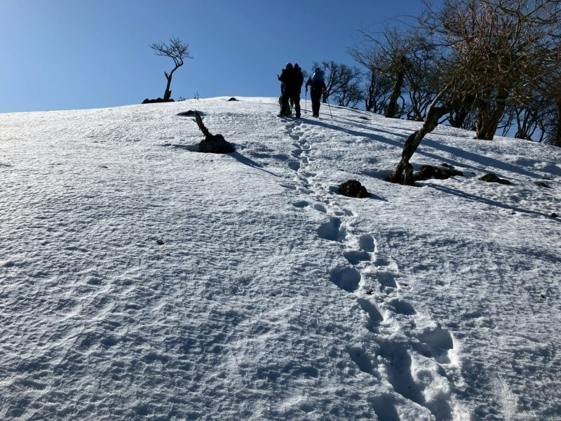 お天気が良く、仲間の先行ラッセルに助けられて、気持ちよく鈴北岳へ到着。続いて鞍掛峠へ向かっての下り。広い尾根なので尾根の中心を歩けば滑落の心配はない。北側の斜面なので存分の雪。【つぼ足】の我々、下ろす一歩一歩が膝下くらいまで埋まる。傾斜角度はそこそこあるので、止まらずに次の足を出すのがベター。かくて、急きょ、腿上げ徒競走開幕!下りだけれど、しっかり腿上げして次の一歩を出さないと雪に足がとられて前にコケる。時々太ももまで雪に埋もれて・・・。標高が下がって雪のない樹林帯に入っても、前の連中はスピードを落とさない。156㎝の私は「あんたたちの半分しか足の長さがないんやぞ」と悪態をつぶやきつつ、あっという間の下山。