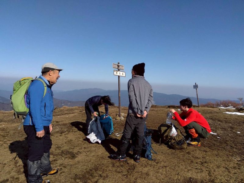 標高が高くなると多少雪があり、山の斜面の向きによっては、ラッセルできる雪。稜線をいくつかのピークを上り下りしながら進む。途中、休憩を兼ねて勉強会。今回のメンバーには遭難捜索現場をよく知る人が二人。冬枯れの木々、下草は雪の下、広くまあるくて見通しの良い尾根の上。実は、道迷い遭難が起こりやすい地形であるので、地図と実際の風景を合わせつつ、遭難例を参考にレクチャー。説明を受けてもなかなかピンとこない生徒たち。とても難しいんです。でも「いつか何かの折にきっと彼ら自身を助ける力になる」と信じて丁寧に教えてくれる先輩たち。