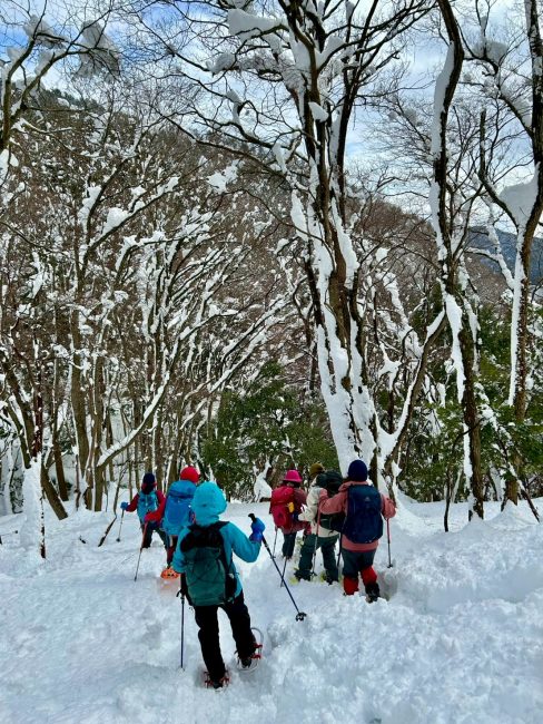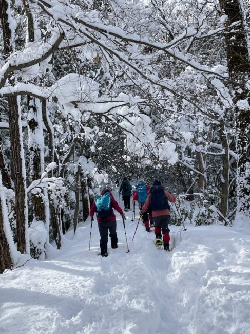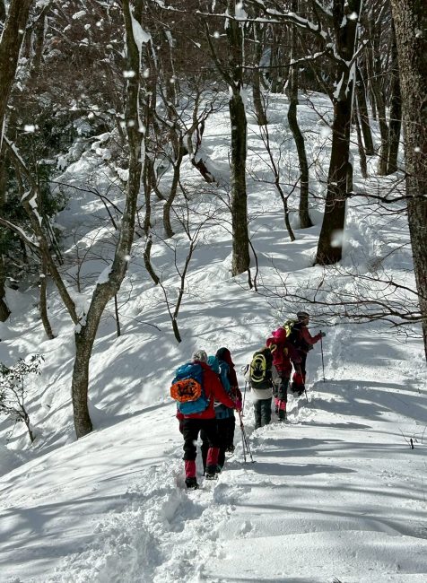 賤ヶ岳から公法寺山方向へ再び進む。予定変更のルート分岐から少し登ったあたりで、この雪を目の前にして、このままワカン履かずに帰れるか!とばかりに、本日2度目のワカン装着。各々好きに雪と戯れ、ワカンのまま下山。予定の電車にも無事乗車。