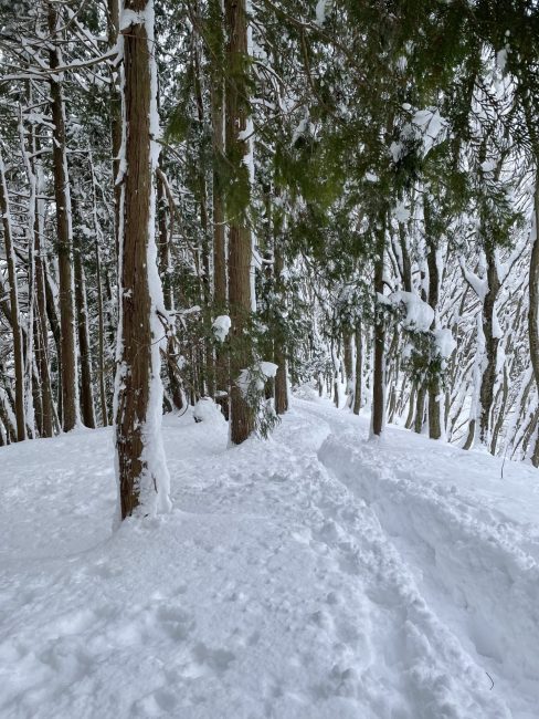 民家の間から始まる賤ヶ岳への登山口を9時半スタート。70〜80cmは積もっているであろう雪の中、しっかりトレースがついていて歩きやすい道。ワカン、スノーシューも必要ない。