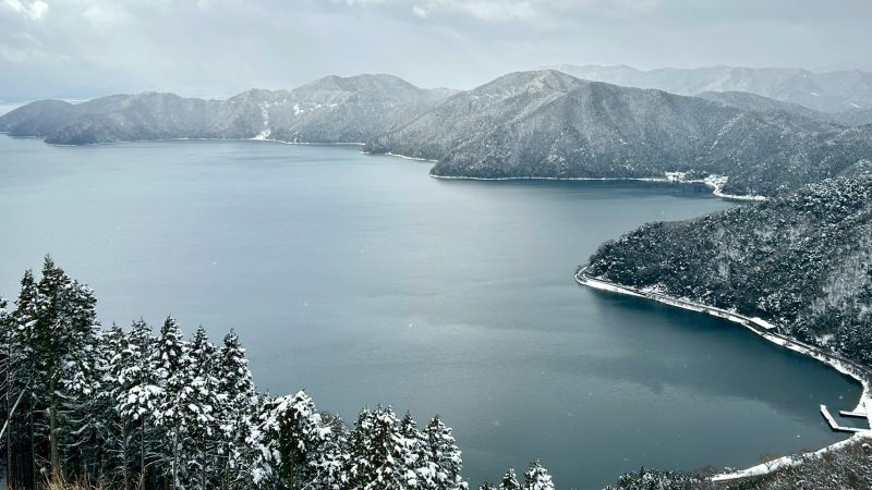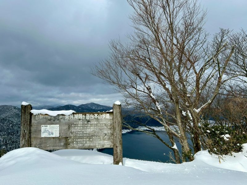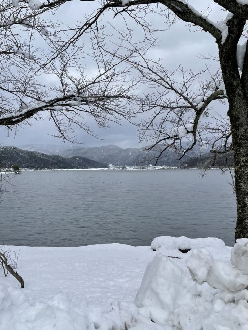 山頂到着12時20分。この日の天気は曇り時々雪。山頂の気温は1度もない。風もきつく、寒い寒い。しかし、ここからの琵琶湖と余呉湖を同時に楽しめる、この雪景色を私は見たかった!展望台からのんびりというわけにはいかないが、お昼休憩を取りつつ、この景色に見入っていた。