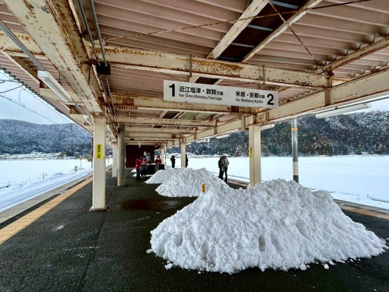 9時前、余呉駅に到着。辺り一面銀世界。ホームにも雪の山!初めて見る光景にビックリ!改めて雪の多さを実感する。駅から登山口までの車道脇にも雪の山。車に気をつけながらも歩くのに難儀する。