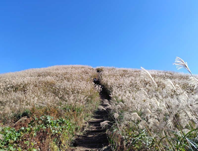 槇尾山登山口から整備された参道を登り、山頂の施福寺を参拝。そこで、槇尾山ダイトレ起点を確認し、岩湧山方面へ向かう。岩湧山の山頂まで高さはあるものの登山道はよく整備されて歩きやすく、あっという間に空が見えてきたと思えば、目の前に広がる一面のススキ。ちょうど見頃のススキが青空に映えてとてもきれいでした。山頂は多くの登山客でかなり混雑するも何とか場所を見つけて気持ちよくお昼休憩。