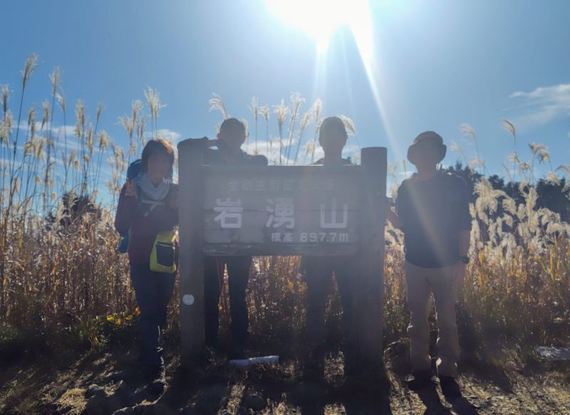 岩湧山の山頂で集合写真。逆光で良く見えないけど、背景にススキ良い感じ。