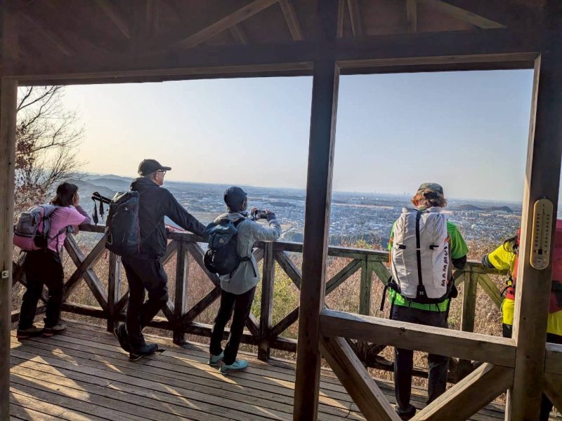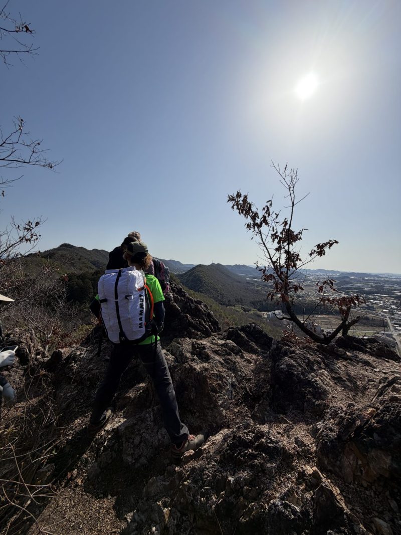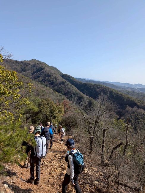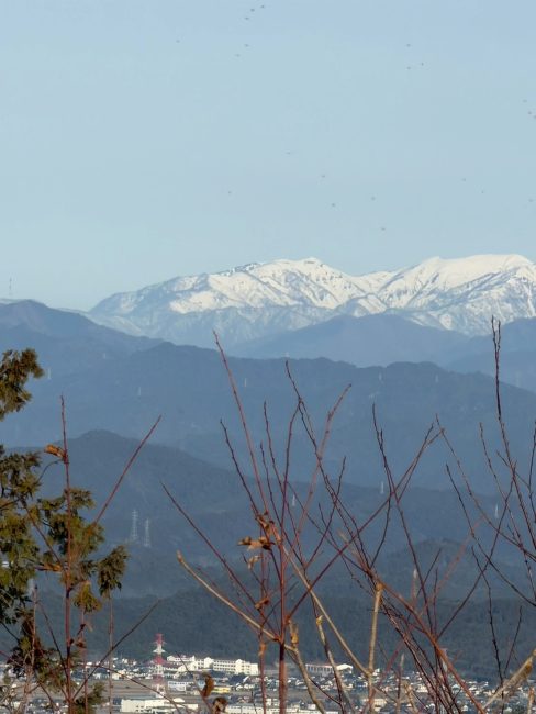 この日は、雲一つない青空が広がり、終始、雪をかぶった能郷白山、乗鞍岳、御嶽山、南アルプスなどの大展望が広がる。300㍍以下の低山でこの大展望が広がるのは、この山の最大の魅力だろう。