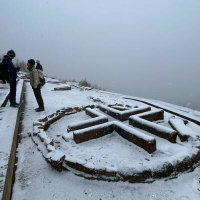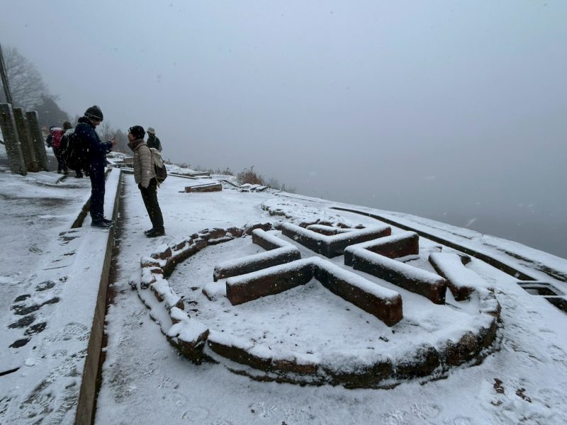 火床、大文字山山頂から見る下界は雪雲の中。なんにも見えない。居合わせた他のパーティーから、「平安京は、真っ白な中」と聞こえてきた。