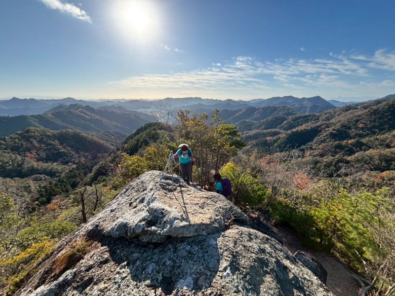 紅葉も終番の落葉の多い登山道。滑りやすいので、気を付けながら、尾根続きの岩稜帯を進みます。屏風岩、観音岩、長いくじら岩を通過。途中七種山塊の山々がきれいに見えます。山頂までは、2時間弱で到着。