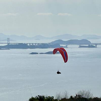 山頂の新割山(233.8m)まで行くと、パラグライダーエリアにたくさんの人が集まっている。