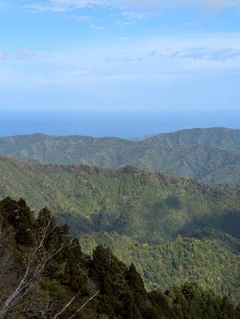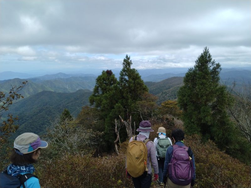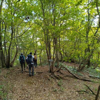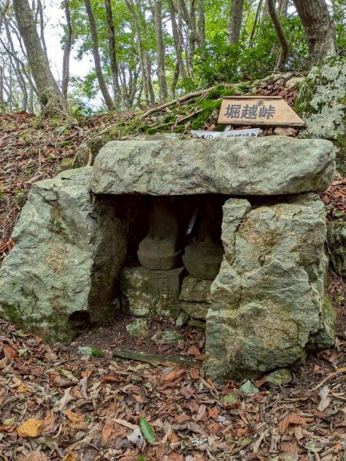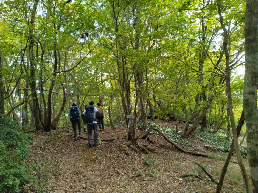 稜線のブナ林では木々の隙間から海が見える。細かなアップダウンを楽しみながら頭巾山に到着。早いお昼を楽しんでから下山。行きに稜線に出てから吹き続けていた風がずいぶん強まり、寒くはないが体力を削いでいかれる感じがする。帰りは、横尾峠のお地蔵さまにご挨拶して横尾峠ルートを下る。こちらは、ブナ林の中を安心して歩ける広めの登山道だった。