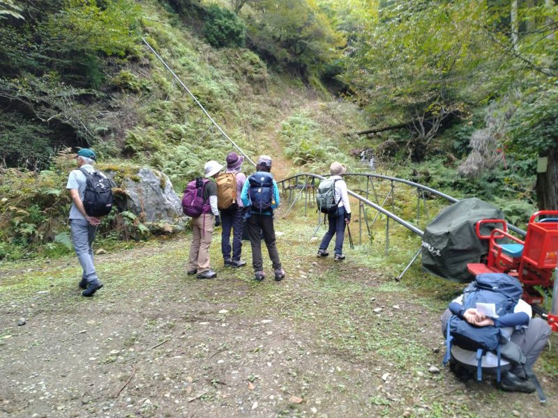 このルートは関電の送電線の巡視路。一つ目の鉄塔について、ヒルが付いていないかと確認していると、下から作業用モノレールに座って上がってきた作業員の男性たち。「クマに気を付けてね~。」「は~い。」なんて挨拶をしながらもゆっくりと追越して行く。ちょっと羨ましかったけれど、「我々は歩きに来たんだ」とすぐに打ち消す。