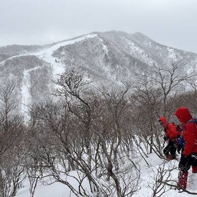 峠から国見山頂の手前まで登り、木々の間でスタカットクライミングのロープワークを行うが、あんまり寒いので60m登ったところで終わり、あとはゴンドラ駅まで急いで登る。きつい風でトレースはほとんど消え、キレイな雪の斜面を雪が流れていた。