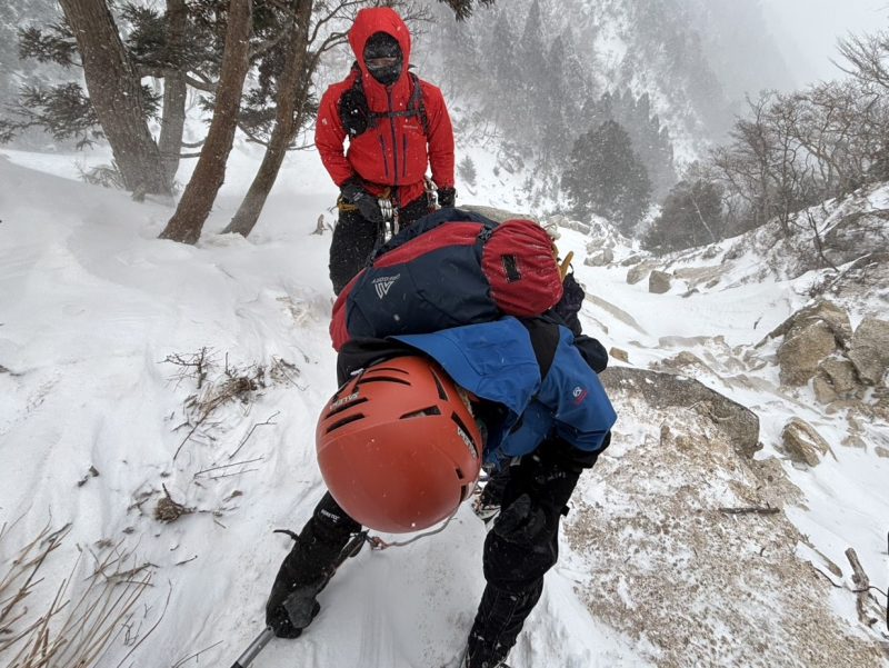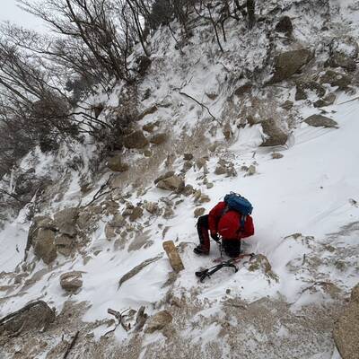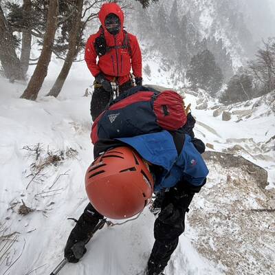 場所を確認し、谷に下りて少し登ると岩にしがみついた人影が…??近づくと母親とその娘と思われる2人が、雪まみれで岩に覆い被さるようにしがみついている。「ここどこですか?」「はあ!どこへ行くつもり?」「ここ道ですか?」「道は向こうにある。もどるんやったら、この踏み跡を辿れば帰れるから…それに、なんちゅう靴(スニーカーの姉さんみたいな?)履いてんや!」「死ぬで!!はよ、道に戻り、下りた方がよい!」…現場でのやりとり再現…。