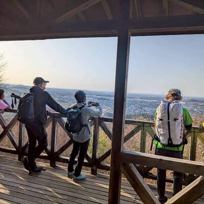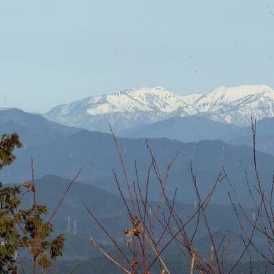 この日は、雲一つない青空が広がり、終始、雪をかぶった能郷白山、乗鞍岳、御嶽山、南アルプスなどの大展望が広がる。300㍍以下の低山でこの大展望が広がるのは、この山の最大の魅力だろう。